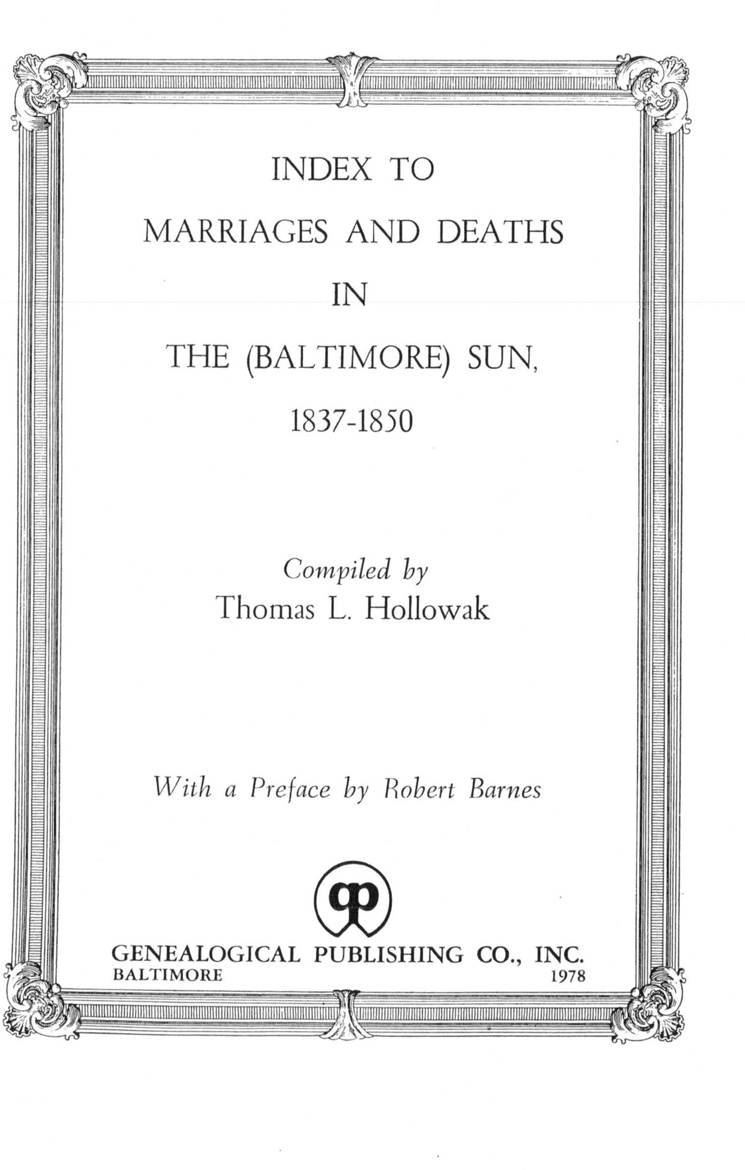 Title page for "Index to Marriages & Deaths in The (Baltimore) Sun 1837-1850"