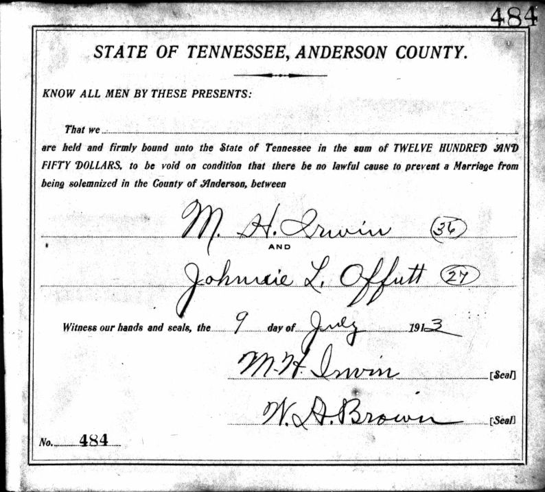 Marriage Bond for Johnnie Offutt & M. H. Irwin