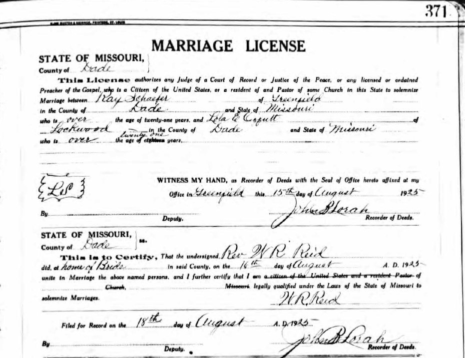 Dade County Missouri Marriage Record for Lola E. Offutt and Ray Schaefer