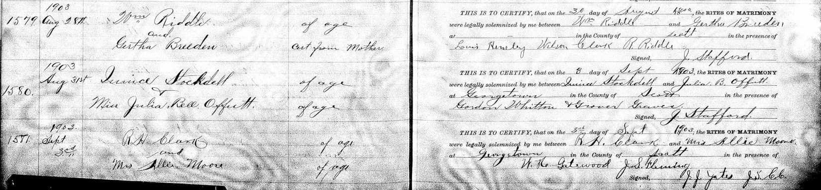 Page 354; Marriage #1580; Quince Stockdell and Julia Bell Offutt