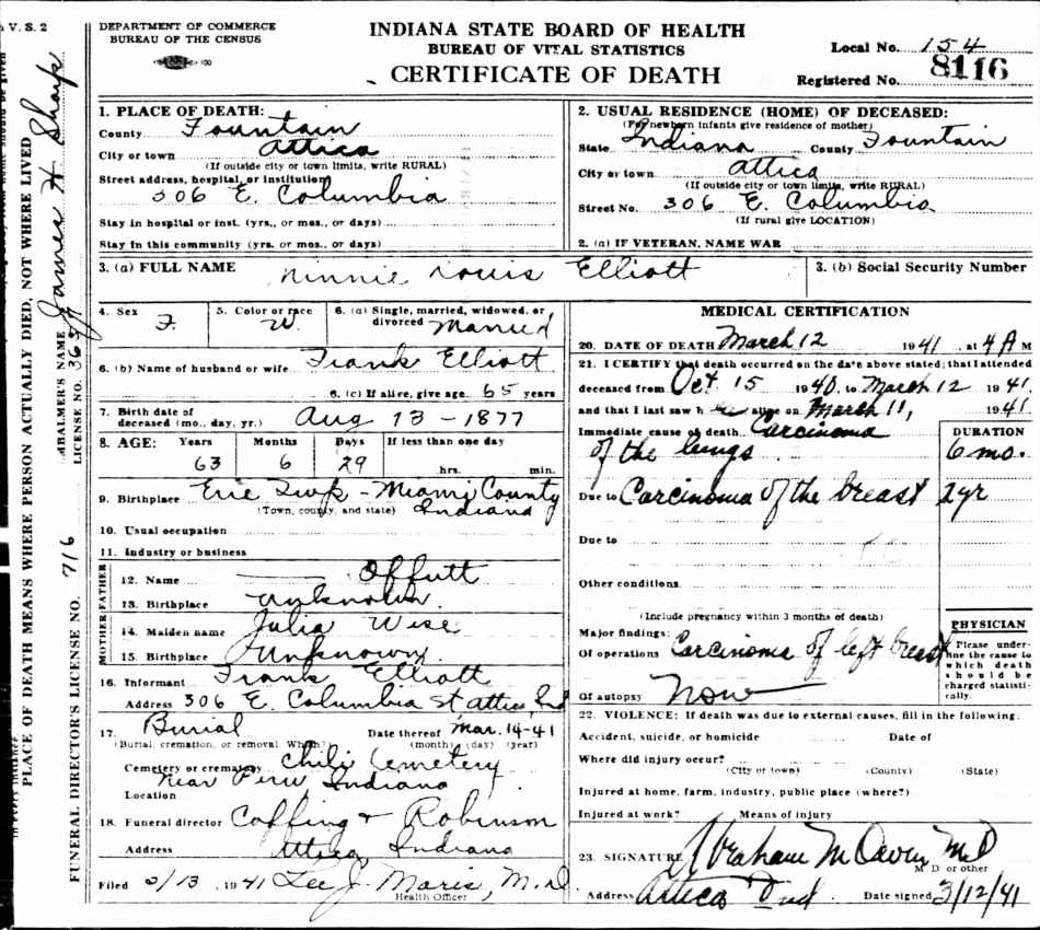 Certificate of Death; Indiana State Board of Health; Bureau of Vital Statistics
