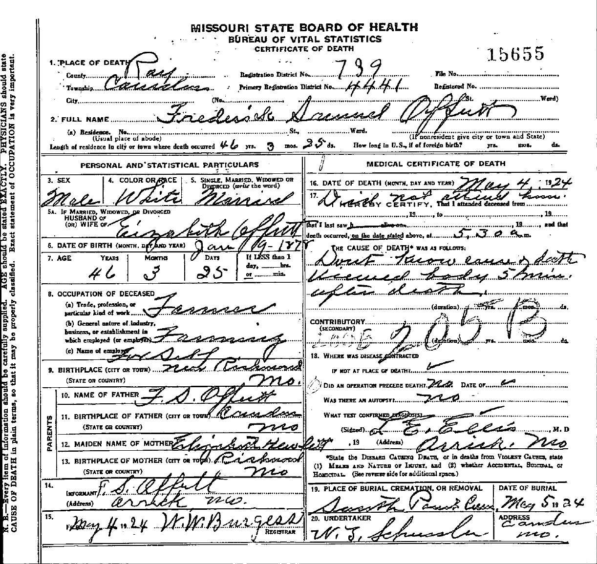 Missouri Death Certificate #15655 for Frederick Samuel Offutt