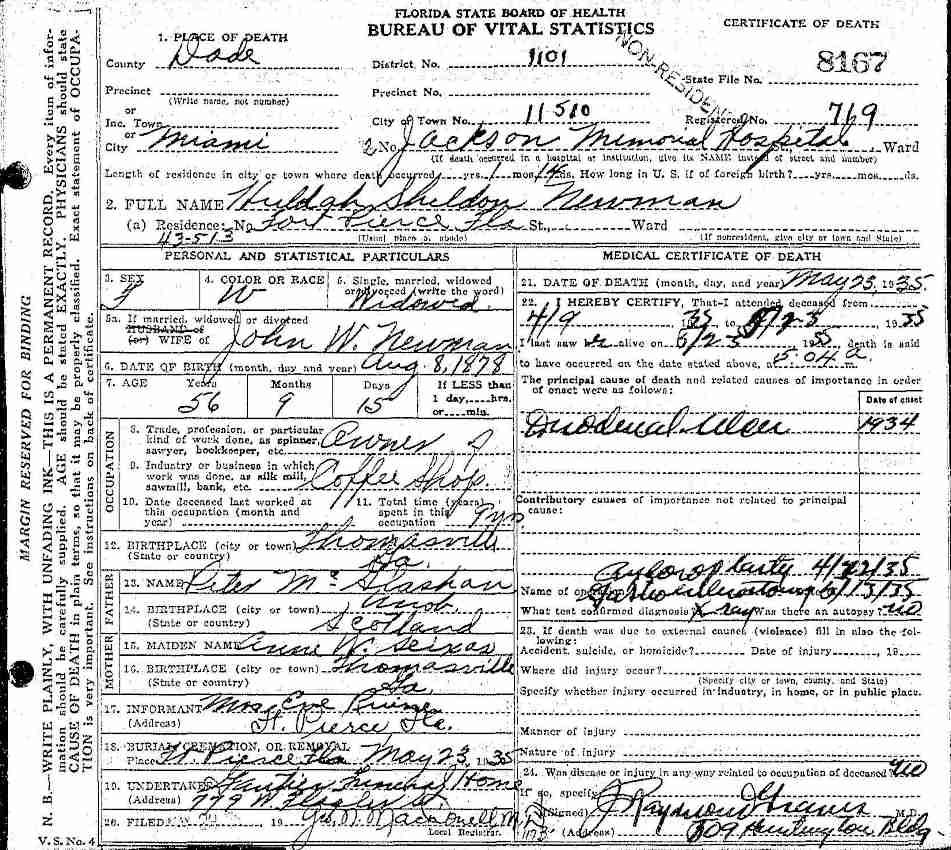Florida Death Certificate for Mrs. Huldah Sheldon Newman