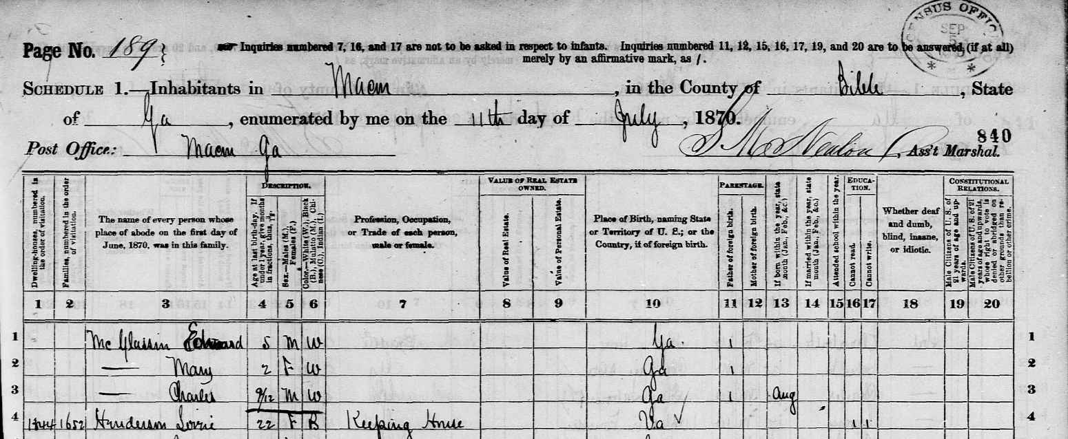 1870 Federal Census; Macon, Bibb County, Georgia. Household of Peter McGlassin (As enumarated), continued from page 188