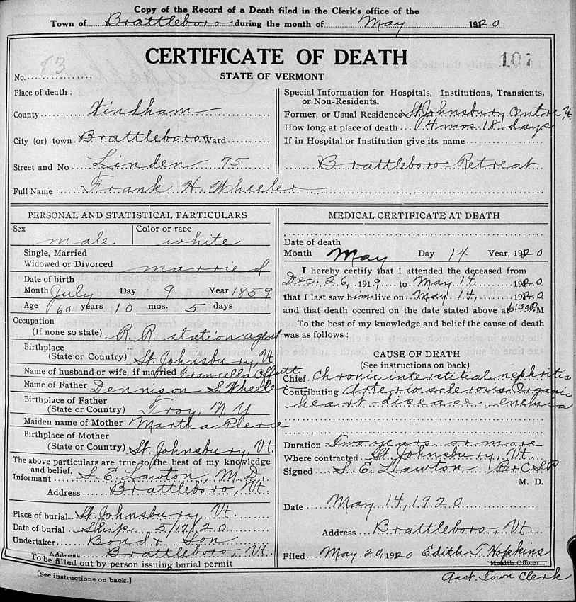 Vermont Death Certificate for Frank H. Wheeler