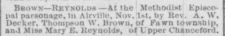 Marriage of Thompson W. Brown and Miss Mary E. Reynolds