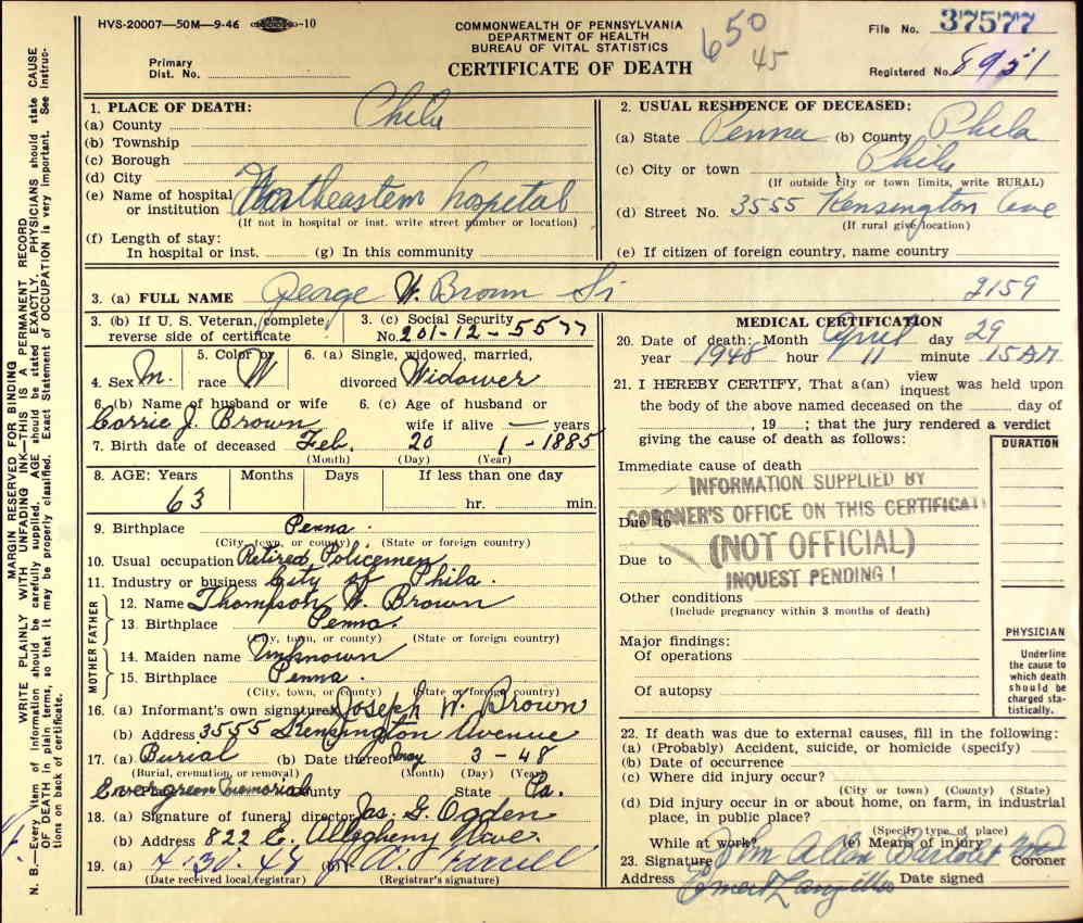 Pennsylvania Certificate of Death for George W. Brown