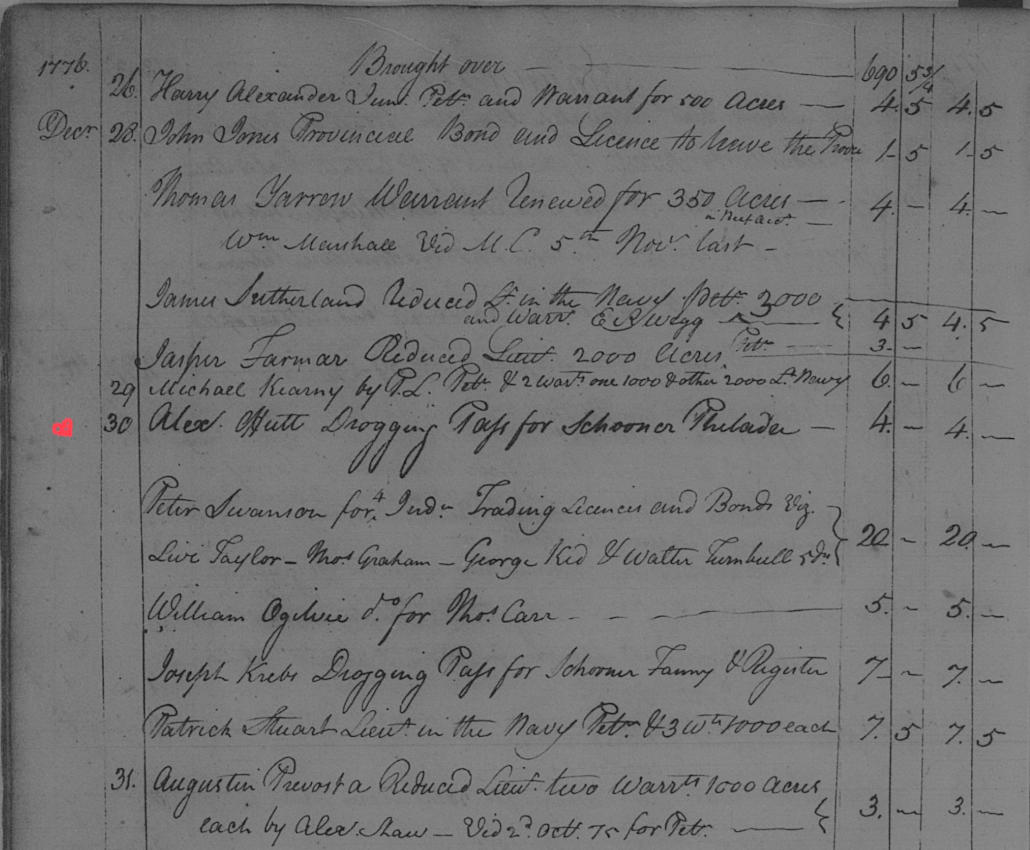 Image from the West Florida Collection, a microfilm containing records going back to when Florida, as well as other areas was controlled by the British during the Revolutionary War. This page in particular documents Alex Offutt paying it appears £4 for a droggiing pass for the schooner Philader? in Dec 1776; found on reel 2, covering boxes 7 through 9. (Drogging vessels, or “drohgers,” were “small vessels that brought cargo out to merchant ships or plied coastal trade)