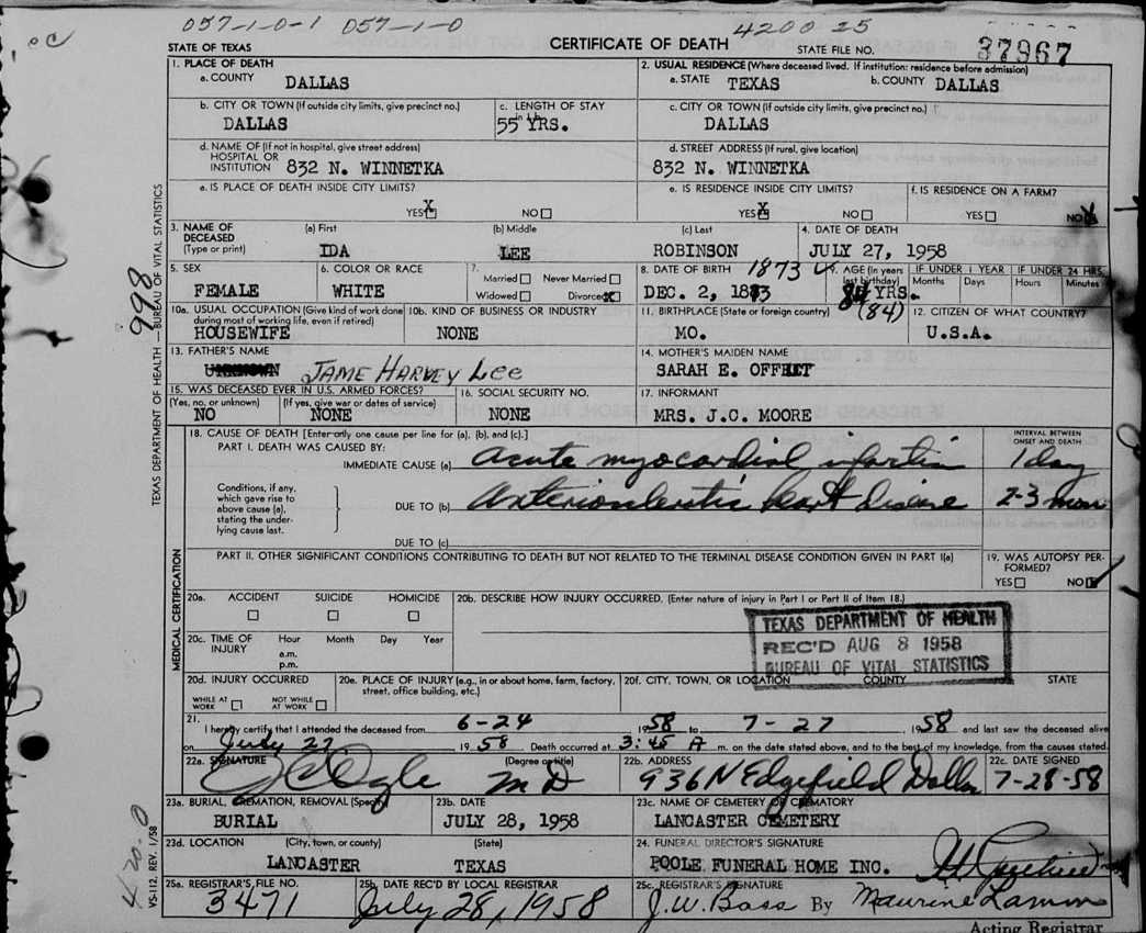 Texas Death Certificate for Ida Lee Robinson
