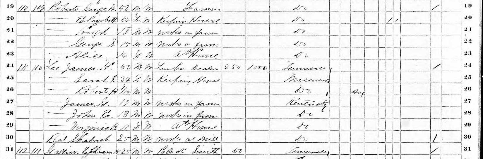 1870 Federal Census; Voting District 2, Rockcastle County, KY. Household of James H. Lee
