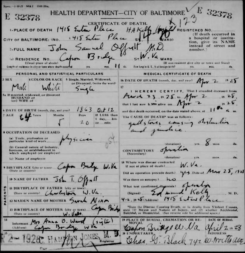 Health Department - City of Baltimore; Death Certificate for John Samuel Offutt, M.D.