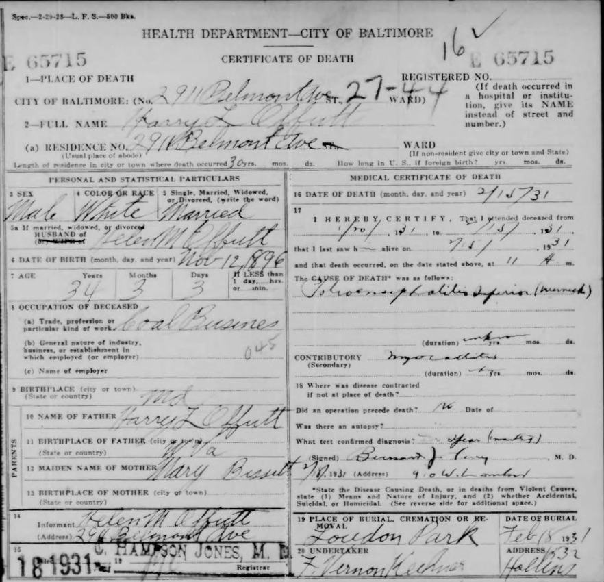 Health Department - City of Baltimore; Death Certificate for Harry L. Offutt