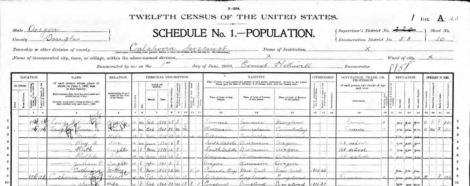 1900 Federal Census; Callapooia Precinct, Douglas County, Oregon. Household of Erwin A. Langdon