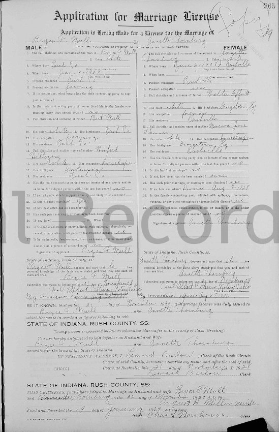 Rush County Indiana Marriage Record for Annette Offutt Thornburg and Bryce F. Mull