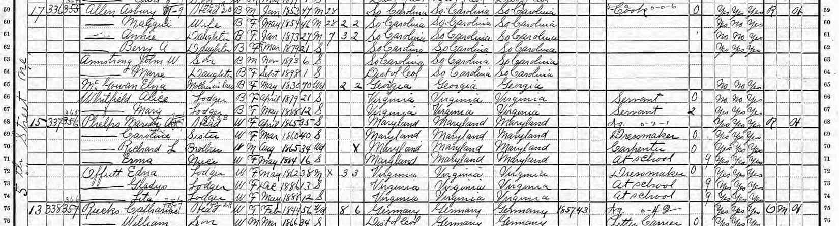 1900 Federal Census; Washington, DC. Household of Marion Phelps, Edna Offutt listed as a lodger