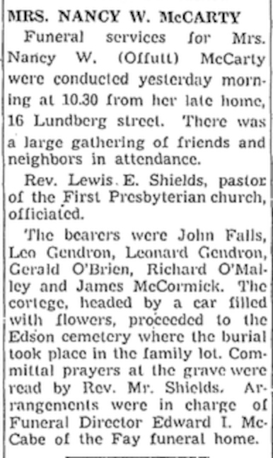 Funeral of Mrs. Mary W. (Offutt) McCarty