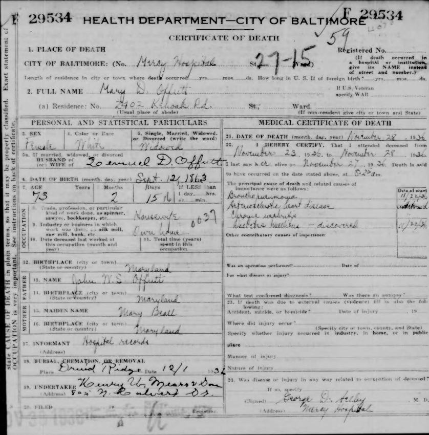Certificate of Death for Mary D. Offutt