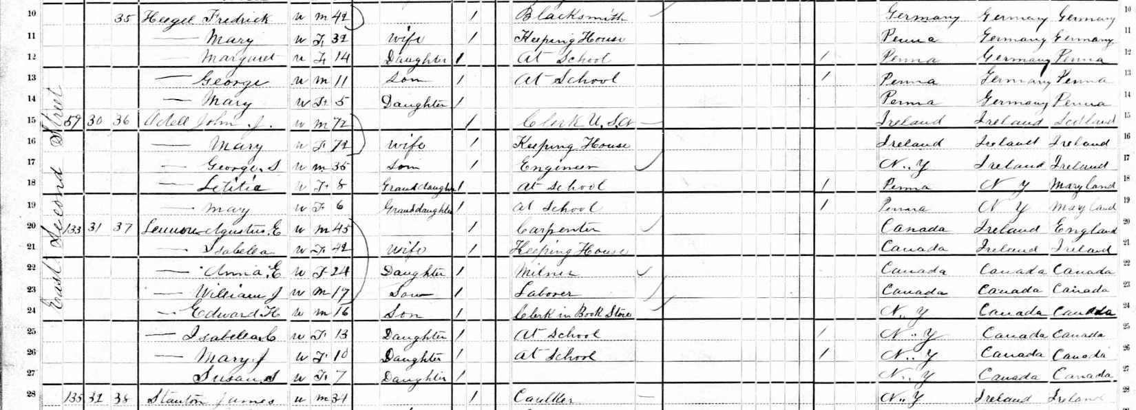 1880 Federal Census; Erie, Erie County, PA. Household of Agustus Lennon (Indexed on Ancestry as Agustus Lennore
