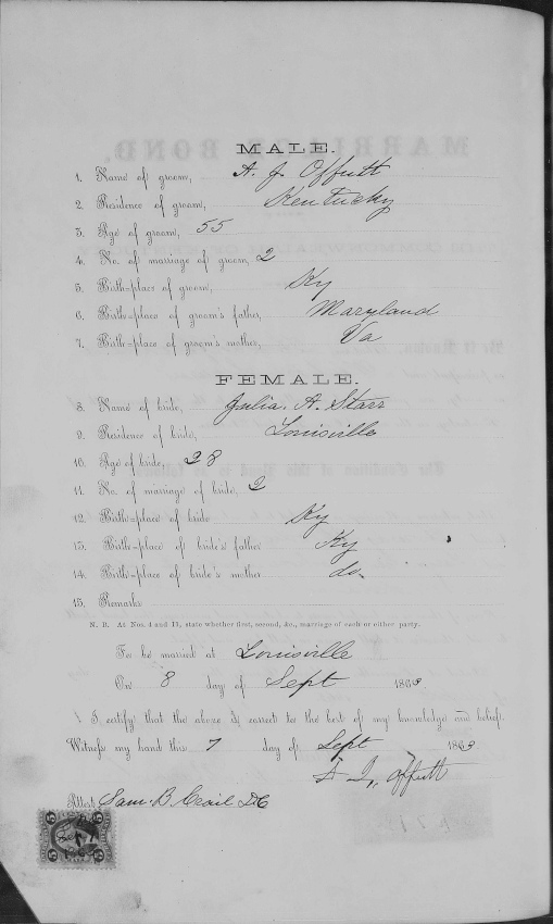 Jefferson County Kentuck Marriage Bond for A. J. Offutt and Julia A. Starr