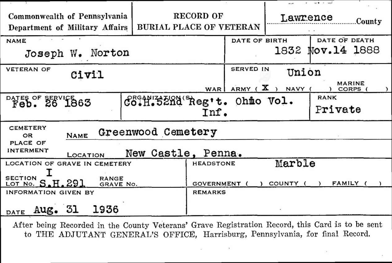 Burial Card for Joseph W. Norton