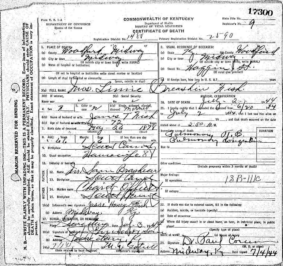 Kentucky Death Certificate for Mrs. Linnie Brashear Fish