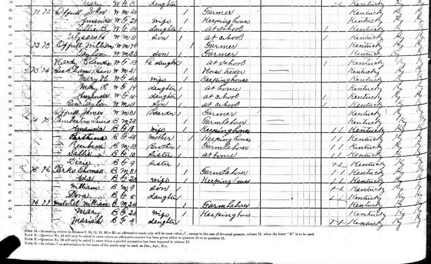 1880 Federal Census of Turkey Foot District, Scott County, Kentucky. Household of Ben Beckham