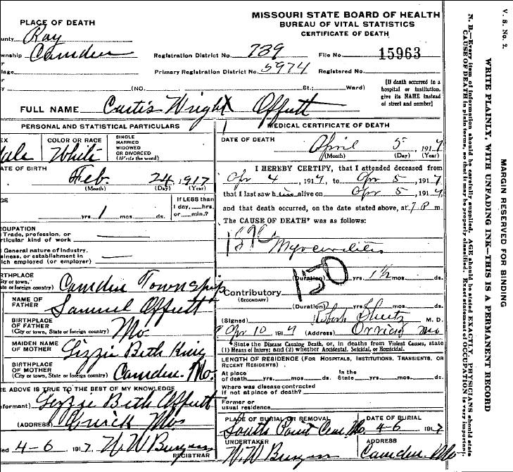 MO Death Certificate # 15693 for Curtis Wright Offutt