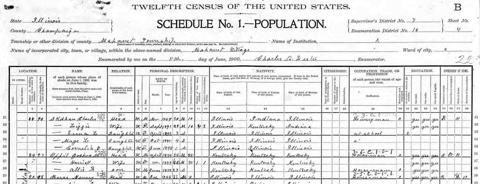 1900 Federal Census; Mahomet Village, Champaign County, IL. Household of Joshua M. Offil (As enumerated)
