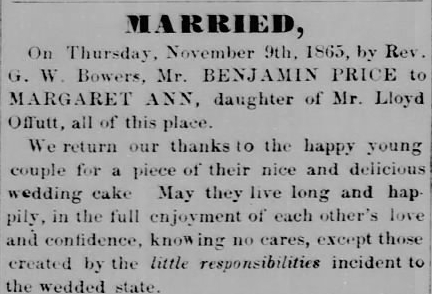Printed in the Thursday, November 16, 1865 edition of The Hancock Democrat on page 3.