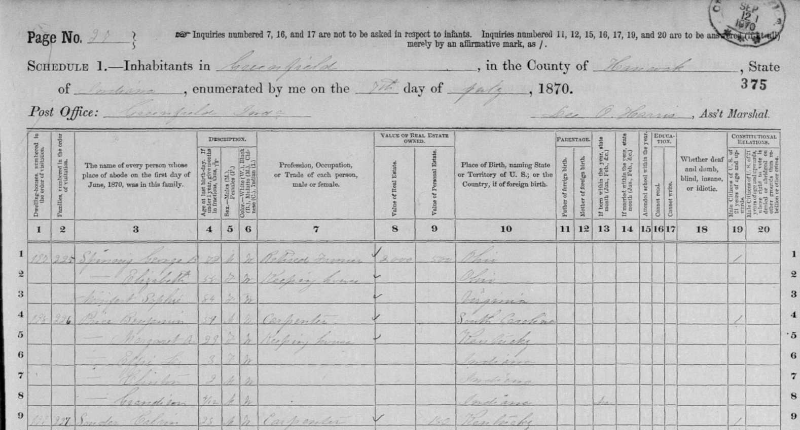 1870 Federal Census of Greenfield, Hancock County, IN. Household of Benjamin Price