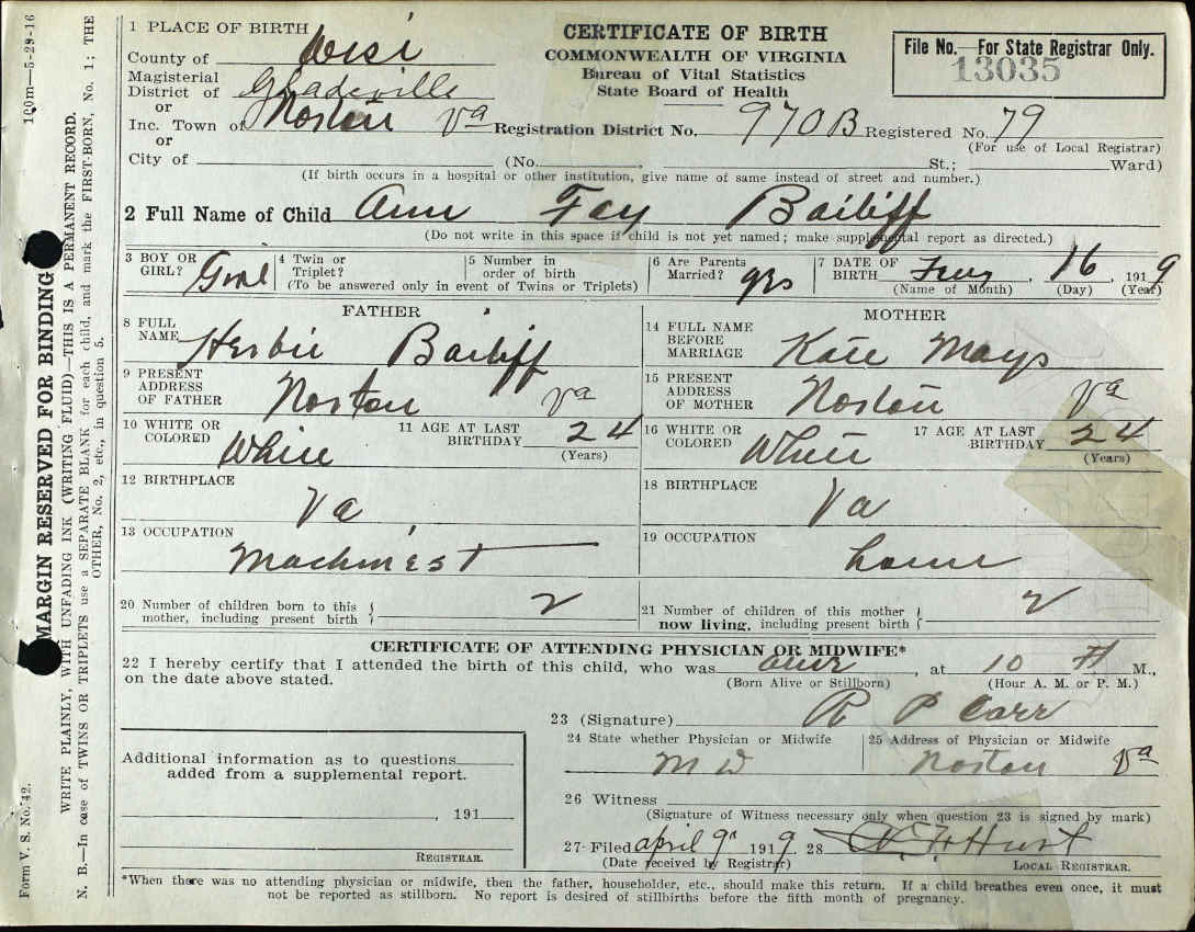 Virginia Birth Certificate for Ann Fay Bailiff