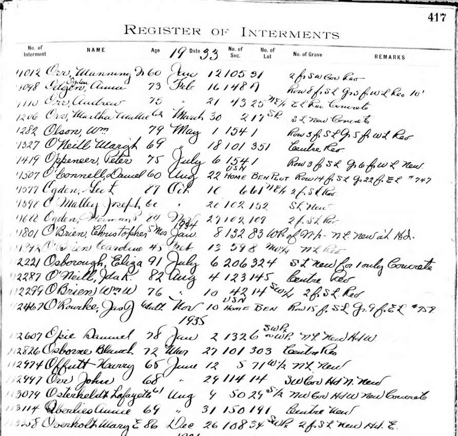 Listing of "O" Burials, number 112974 lists Offutt, Harry, age 65; Date June 12, 1935