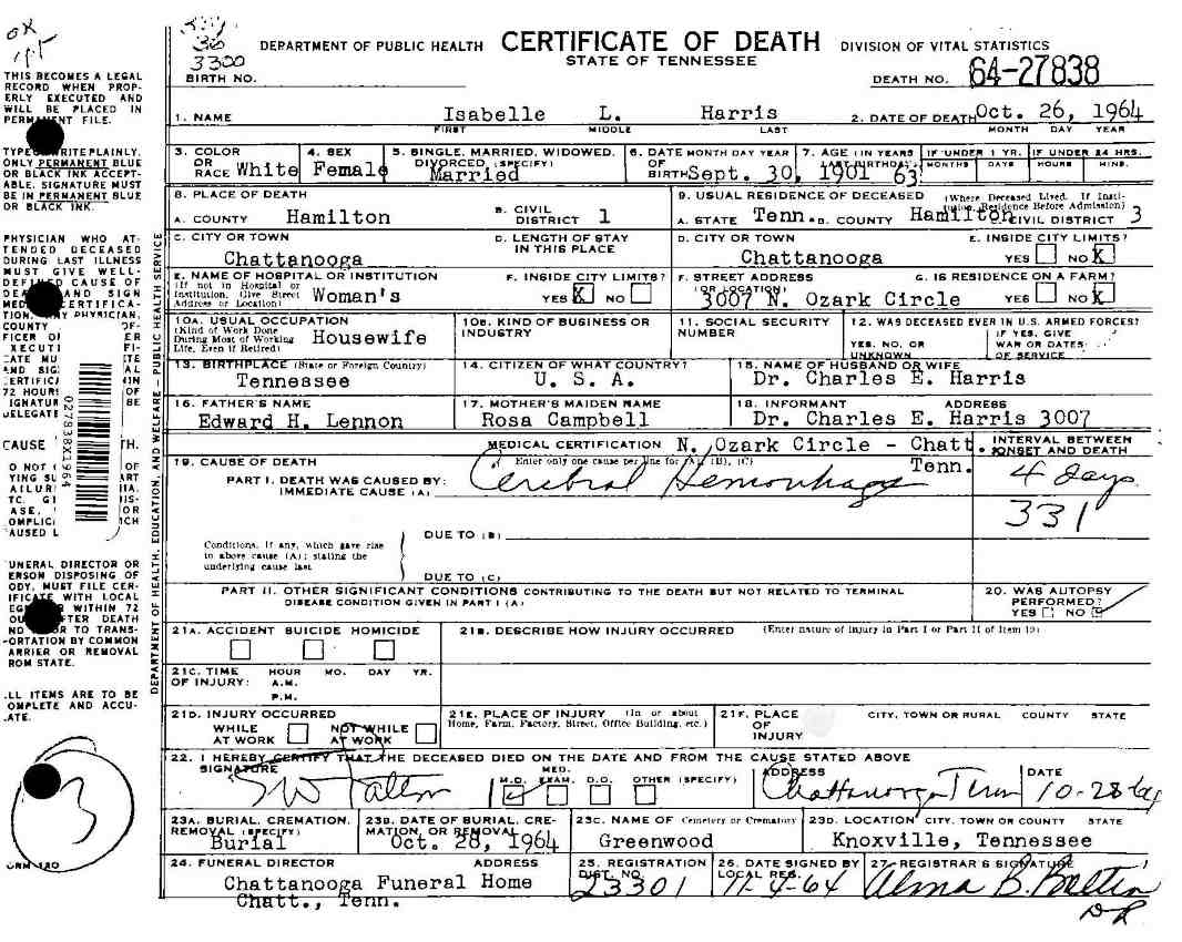 State of Tennessee; Certificate of Death for Isabellle L. Harris