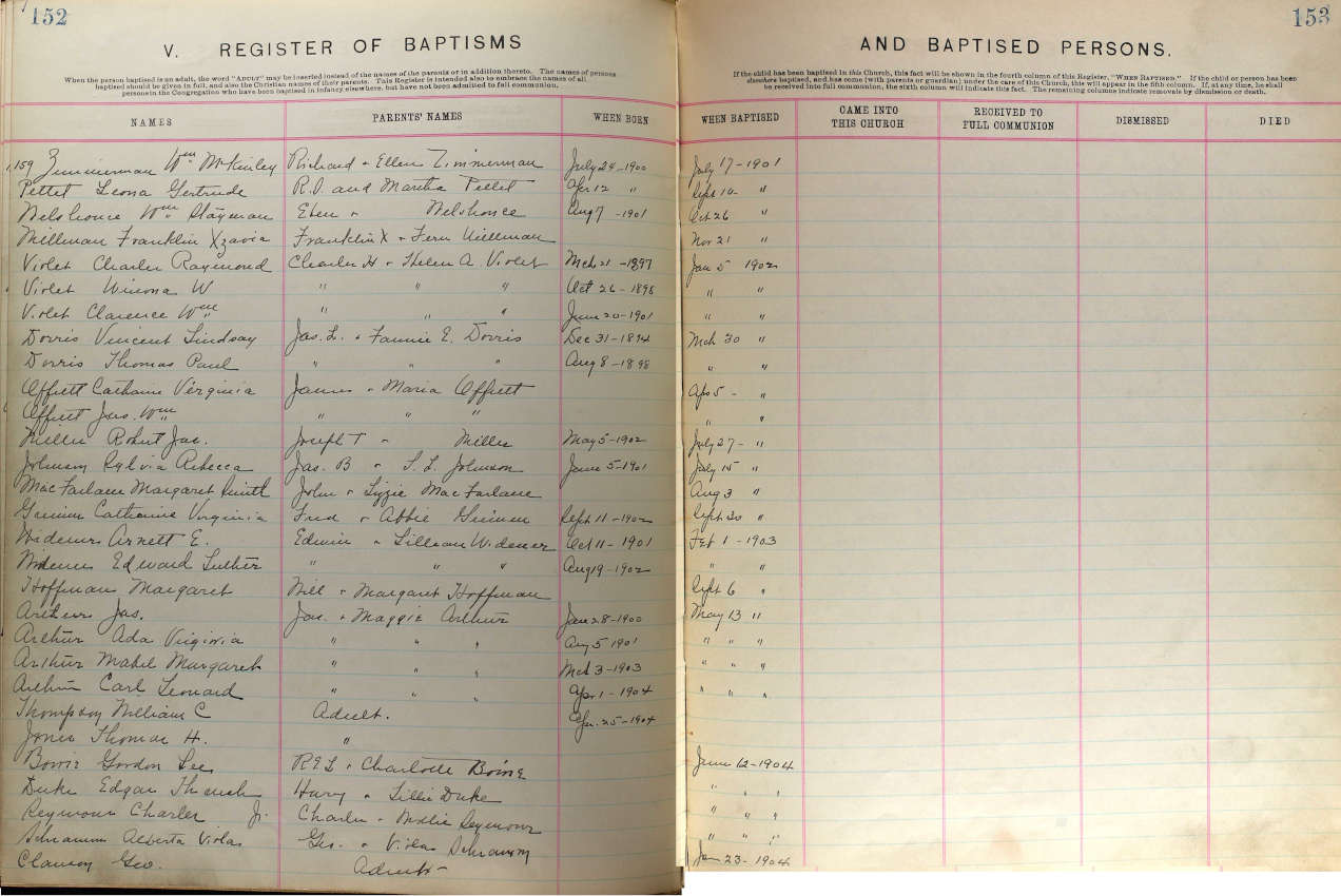 Pages 152 and 153; Register of Baptisms and Baptized Persons