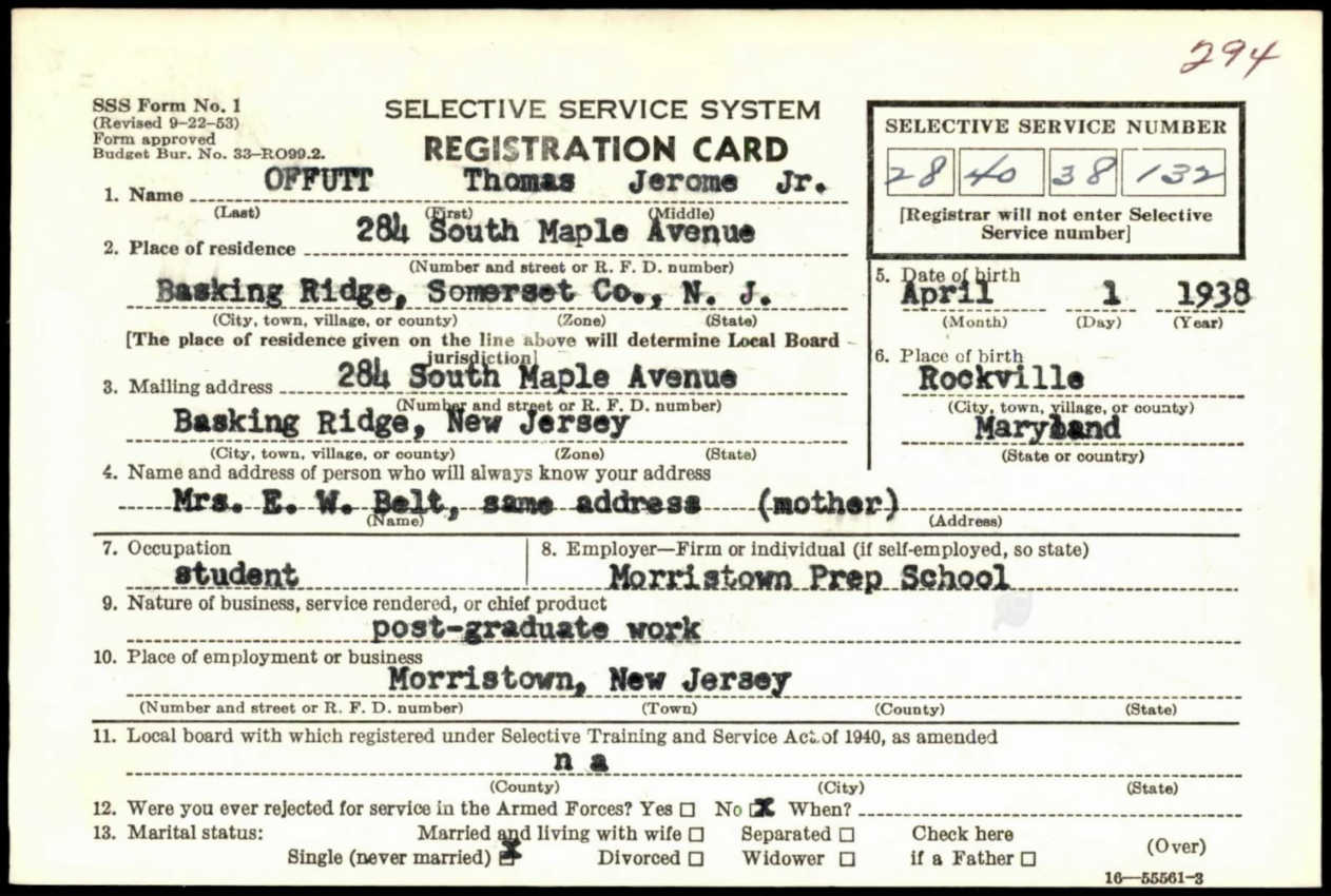 Selective Service Registration Card for Thomas Jerome Offutt Jr.