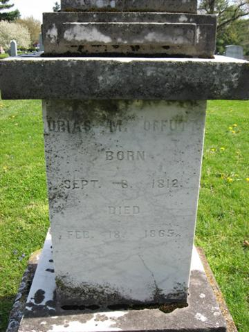 - [S1103] Find A Grave, online http://www.findagrave.com/cgi-bin/fg.cgi, Find A Grave memorial #25788708. Section Lower B, Lot 3647, grave 12. Photo of grave marker. "URIAS M. OFFUTT BORN SEPT. 6, 1812 DIED FEB. 18, 1865."