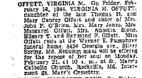 - [S1236] St. Mary's Catholic Cemetery; Rockville, MD, online ftp://ftp.rootsweb.com/pub/usgenweb/md/montgomery/cemeteries/stmarys.txt, Lists "OFFUTT, Virginia 1897 1944."