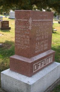- [S1103] Find A Grave, online http://www.findagrave.com/cgi-bin/fg.cgi, Find A Grave memorial #58379114. Photo of side of Offutt grave marker. "HORACE W. BORN & DIED MAR. 11, 1913; HOWARD M. MAR. 11, 1913 MAR. 13, 1913 CHILDREN OF E. R. & O. O. OFFUTT."