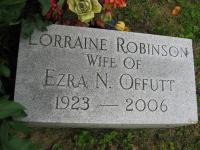 - [S486] Web Site, online unknown url, http://www.tributes.com/obituary/print_selections/90873019. Tribute for Lorraine Robinson Offutt Born: October 8, 1923 Died: July 15, 2006 Location: Georgetown, Kentucky. Tribute & Message From The Family: Lorraine Robinson Offutt, 82, widow of Ezra N. Offutt died Saturday, July 15, 2006 at Georgetown Community Hospital. A native of Georgetown, she was the daughter of the late James T. & Rowena Armstrong Robinson and a member of the Georgetown Baptist Church. Survivors include her daughter, Jane Maddox Offutt, Georgetown, a niece, Lorrie Pike Burton, Georgetown and several cousins. Funeral services will be 11:00 A.M. Tuesday at Johnson’s Funeral Home by Rev. Kenneth D. Holden. Burial will be in the Georgetown Cemetery. Visitation will be 6—8 P.M. today. Expressions of Sympathy may be made to Georgetown Baptist Church.