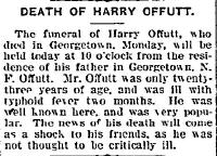 - [S845] Georgetown City Cemetery (KY), online http://www.georgetown-kentucky-cemetery.com/cscemsmain.asp, Lists Harry Offutt, born 6/13/1878 and died 12/28/1903. Buried 12/30/1903.
