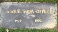 - [S1103] Find A Grave, online http://www.findagrave.com/cgi-bin/fg.cgi, Find A Grave memorial #224309173. Photo of grave marker. "JACQUELINE A OFFUTT 1925 1992."