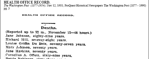 November 12, 1901 issue of The Washington Post; Page 3, Health Office Record, lists Cornelius A. Offutt 69 years old under deaths