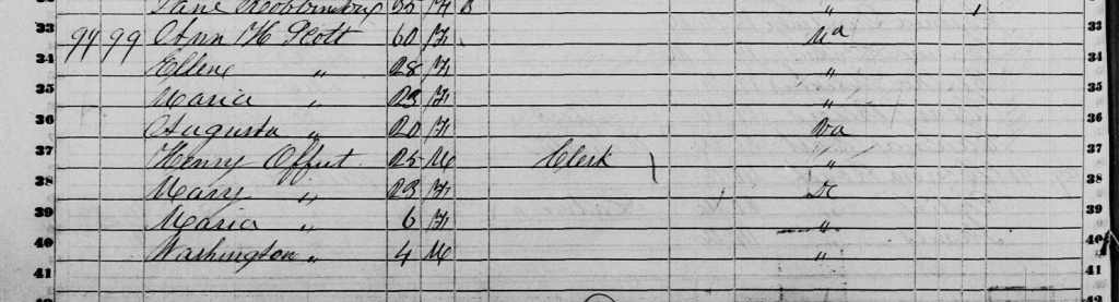 1850 Federal Census; 4th Ward of Washington DC. A Henry Offut is listed in the household of Ann Scoott. Close in shot of area detailing family