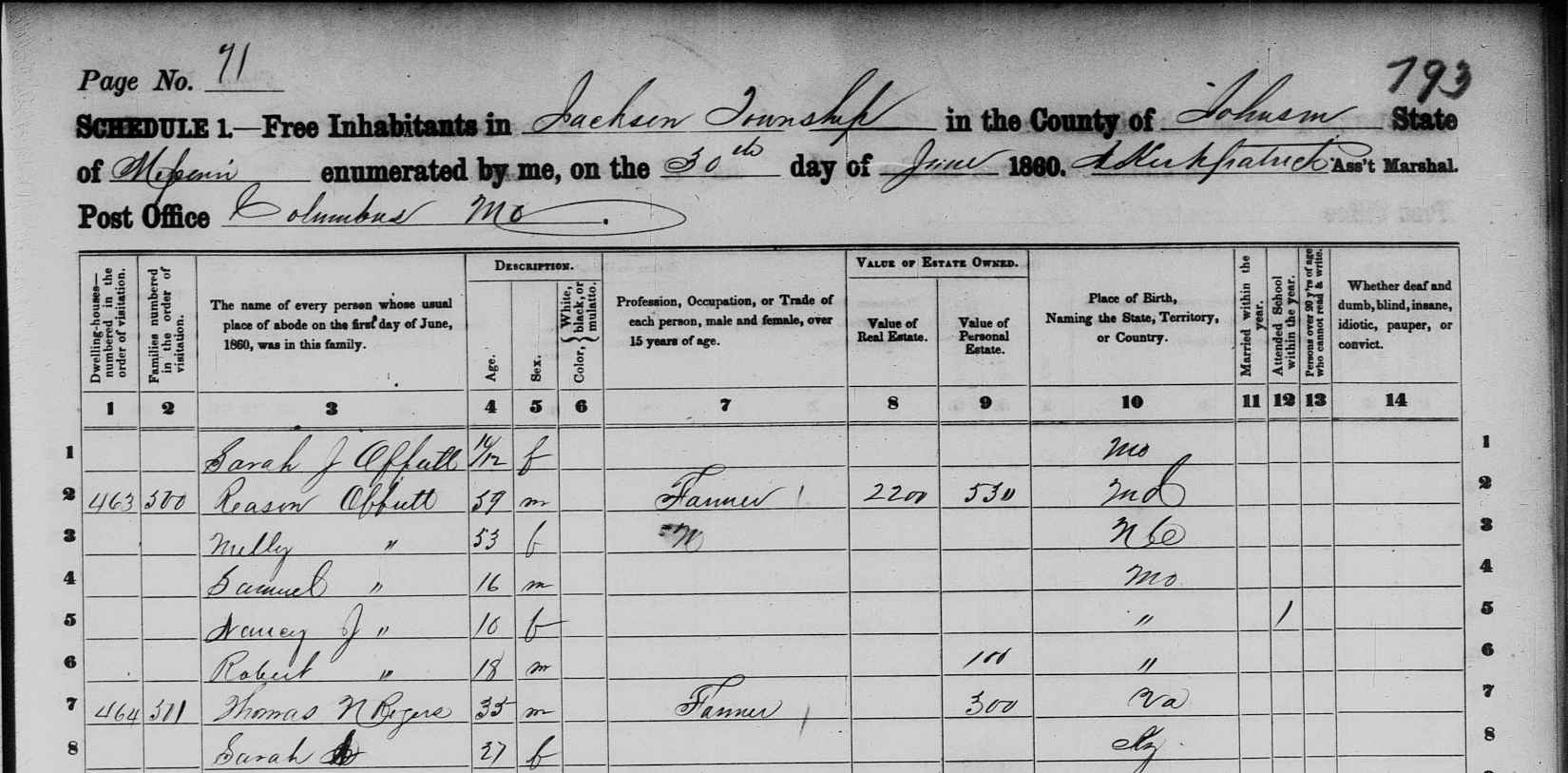 1860 Federal Census; Jackson Township, Johnson County, Missouri. Page 793