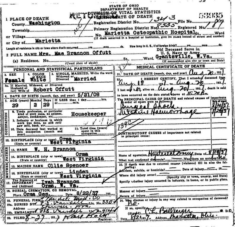 Ohio Death Certificate for Mae Brannon Offutt