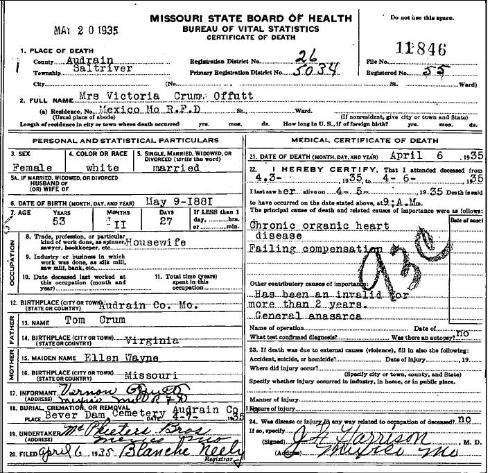 Missouri Death Certificate #11846 for Victoria Crum Offutt