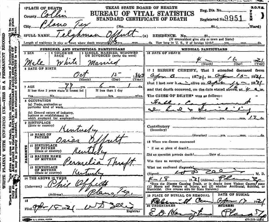 TX Death Certificate for Tilghman Offutt