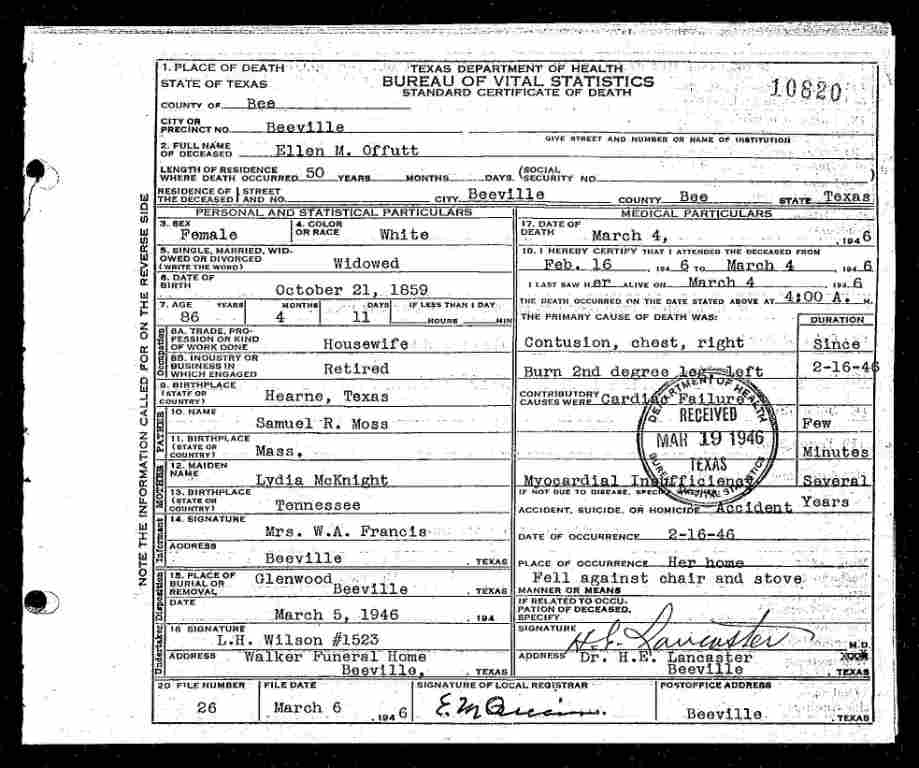 TX Death Certificate for Ellen M. Offutt (nee Moss)