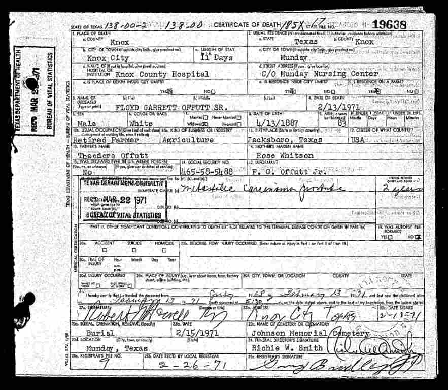 TX Death Certificate for Floyd Garrett Offutt Sr.
