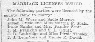 Marriage License issued for J. M. Franklin and S. L. Offutt